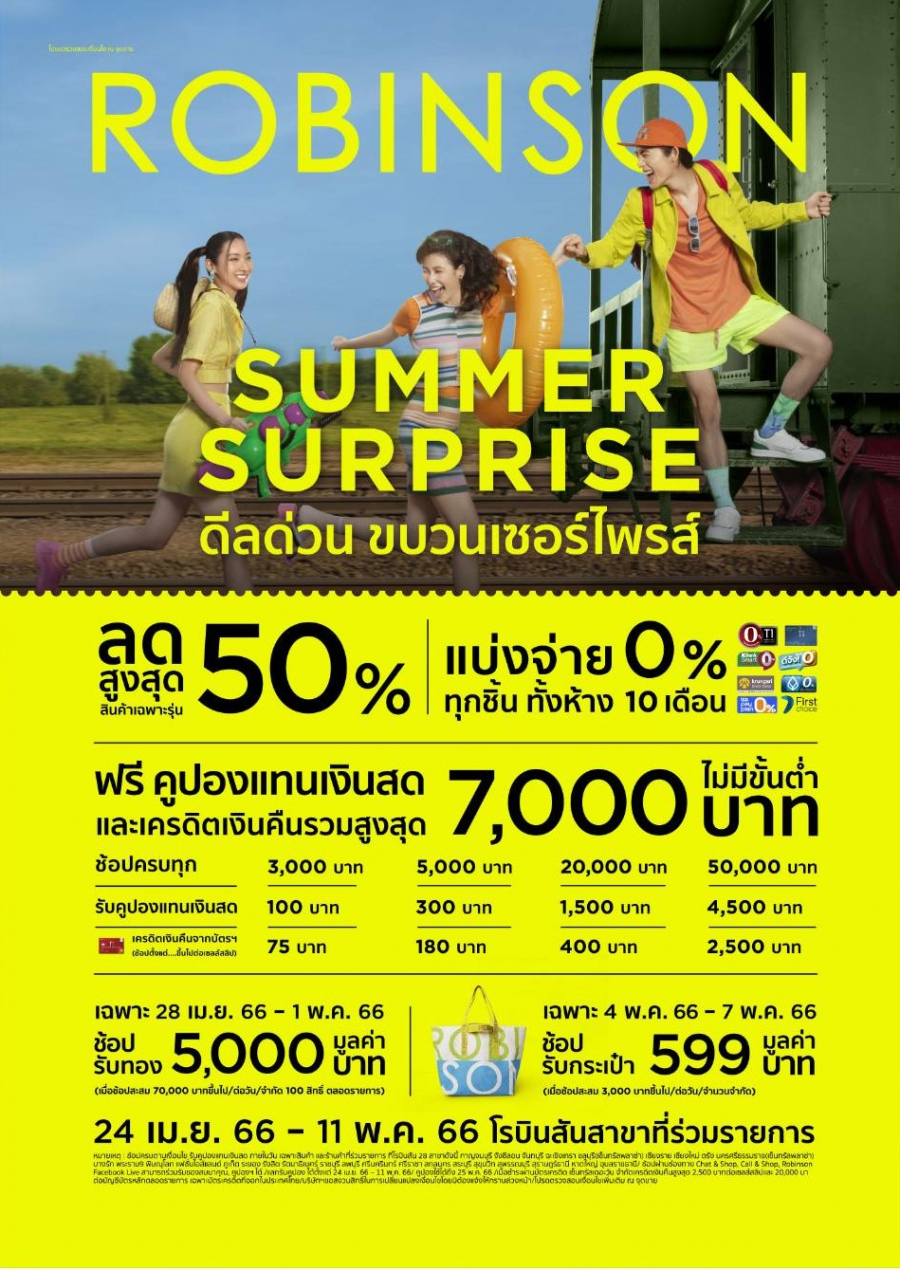 News Update ห้างโรบินสัน ชวนปักหมุดช้อปช่วงชัมเมอร์แบบไม่มีพัก! กับ 2 แคมเปญโปรโมชั่นสุดฮอต “ROBINSON SUMMER SURPRISE” ดีลด่วน ขบวนเซอร์ไพรส์ และ “ROBINSON ช้อปแหลก แจกสนั่น” 24/04/2023 ห้างโรบินสัน ชวนปักห…