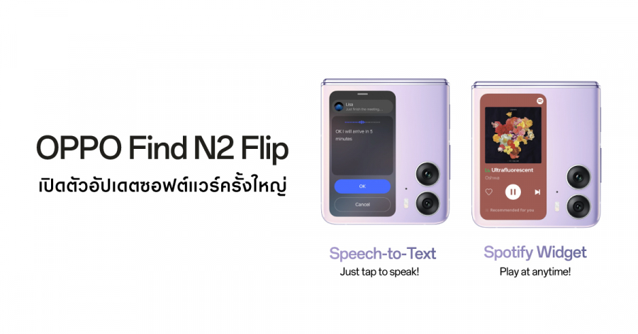 OPPO Find N2 Flip เปิดตัวอัปเดตซอฟต์แวร์ครั้งใหญ่ เพิ่มวิดเจ็ต Spotify ใหม่ และ Speech-to-Text Quick Reply เพื่อประสบการณ์ใช้งานที่ดียิ่งขึ้น การอัปเดตเพื่อพัฒนาประสบการณ์ผู้ใช้สำหรับ Spotify, WhatsApp, Messenger, Messages by Google, Telegram และ LINE