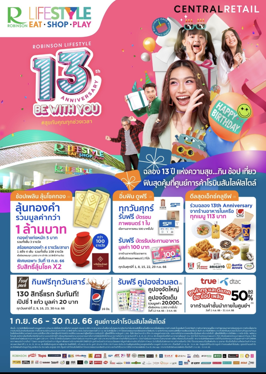News Update ศูนย์การค้าโรบินสันไลฟ์สไตล์ ฉลองใหญ่ครบรอบ 13 ปี ชวนนักช้อป กิน ช้อป เที่ยว ฟินสุดคุ้มกับแคมเปญ “ROBINSON LIFESTYLE 13th ANNIVERSARY BE WITH YOU #สุขกับคุณทุกช่วงเวลา”ลุ้นโชคทองคำรวมมูลค่ากว่า 1.3 ล้านบาท! ตลอดเดือนกันยายนนี้ ก.ย. 2, 2023 ศูนย์การค้าโรบินสันไ…