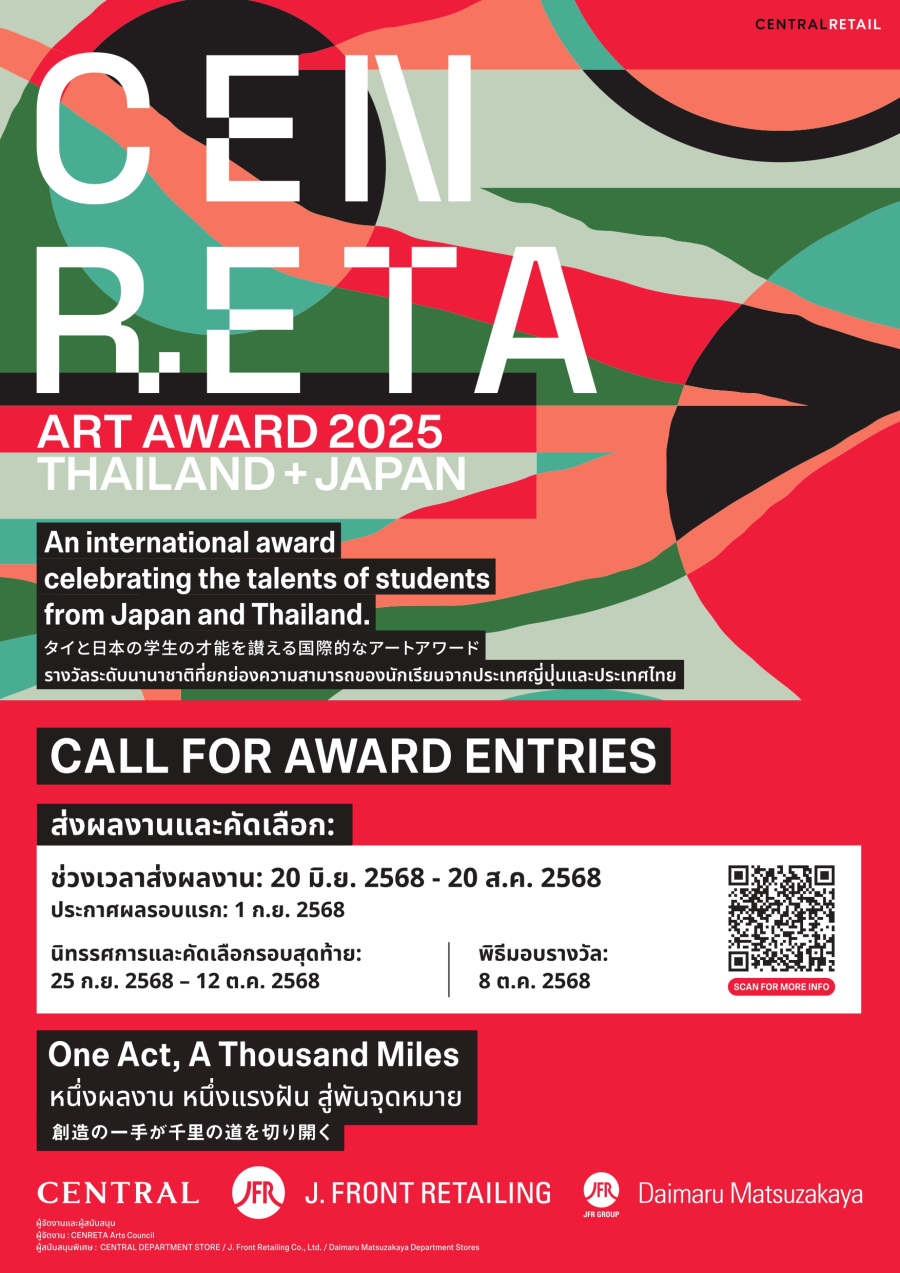 ห้างเซ็นทรัล ในเครือเซ็นทรัล รีเทล เดสติเนชันที่สร้างแรงบันดาลใจในทุกช่วงเวลาของชีวิตของคนทุกไลฟ์สไตล์และทุกเจเนอเรชัน จับมือ J. Front Retailing ผู้นำธุรกิจรีเทลขนาดใหญ่ของญี่ปุ่น เดินหน้าสนับสนุนศิลปินรุ่นใหม่ให้ได้รับโอกาสและการพัฒนาศักยภาพอย่างต่อเนื่อง จัดประกวดผลงานศิลปะนานาชาติ “CENRETA ART AWARD 2025” ภายใต้สโลแกน “หนึ่งผลงาน หนึ่งแรงฝัน สู่พันจุดหมาย (One Act, A Thousand Miles)” เปิดพื้นที่ให้ศิลปินรุ่นใหม่ที่เป็นนักเรียน นักศึกษาในระดับโรงเรียนอาชีวะ มหาวิทยาลัย และระดับบัณฑิตศึกษา ที่อาศัยอยู่ในประเทศไทยหรือประเทศญี่ปุ่น ร่วมส่งผลงานศิลปะเข้าร่วมประกวดในหัวข้อ “EXCHANGE” ที่มุ่งเน้นให้ผลงานสื่อถึงความสัมพันธ์ของตัวเอง คนรอบข้าง หรือสิ่งของต่าง ๆ ท่ามกลางโลกในยุคดิจิทัลที่ศิลปะได้เชื่อมต่อสิ่งเหล่านี้เข้าหากัน โดยมีเนื้อหาหลักที่สำคัญ ได้แก่ การแลกเปลี่ยน, การเปลี่ยนแปลง, การสะท้อน, การเจรจาข้ามวัฒนธรรม, มุมมองใหม่, การใคร่ครวญ, การค้นพบ, การมีปฏิสัมพันธ์, การข้ามพรมแดน สู่การค้นพบศักยภาพที่ไร้ขีดจำกัดของตนเองผ่านผลงานอันสร้างสรรค์ ชิงเงินรางวัล พร้อมโอกาสจัดแสดงผลงานในงานศิลปะระดับนานาชาติ! ที่ห้างเซ็นทรัลชิดลม อาร์ตคอมมูนิตี้สุดชิคใจกลางกรุงเทพมหานคร
