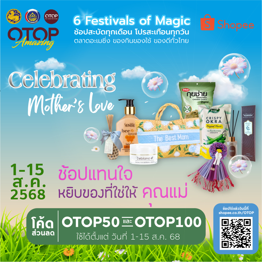 ทั้งนี้แคมเปญ “OTOP Amazing – Celebrating Mother’s Love” ซึ่งเป็นแคมเปญที่ 2 ของโครงการจัดขึ้นระหว่างวันที่ 1-31 สิงหาคม 2568 บนช้อปปี้ ที่พร้อมรับโค้ดส่วนลดหลากหลาย รูปแบบสูงสุดถึง 50% ผู้สนใจสามารถติดตามและสั่งซื้อได้ที่ https://shopee.co.th/otop หรือ พิมพ์คำว่า OTOP หรือ โอทอป ในช่องค้นหาในแพลตฟอร์ม ช้อปปี้ ได้ตลอดทุกวัน 24 ชม.