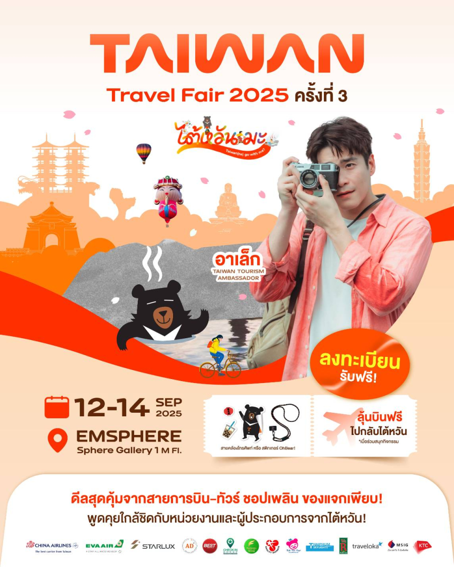 สำนักงานการท่องเที่ยวไต้หวัน ประจำกรุงเทพฯ (Taiwan Tourism Administration, Bangkok Office) เตรียมจัดงาน “Taiwan Travel Fair 2025” งานมหกรรมส่งเสริมการท่องเที่ยวไต้หวันครั้งยิ่งใหญ่ประจำปี 2568 (ครั้งที่ 3) ระหว่างวันที่ 12-14 กันยายน 2568 เวลา 10:00 – 20:00 น. ณ Sphere Gallery 1 ชั้น M ศูนย์การค้า EMSPHERE ภายใต้ธีม “ไต้หวันมะ Taiwan(na) Go With Me?” เชิญชวนคนไทยออกไปสำรวจมุมมองใหม่และสถานที่ UNSEEN ของไต้หวัน ให้การเดินทางเป็นมากกว่าการท่องเที่ยว แต่เป็นโอกาสในการค้นพบตัวเองและสร้างความทรงจำไม่รู้ลืม