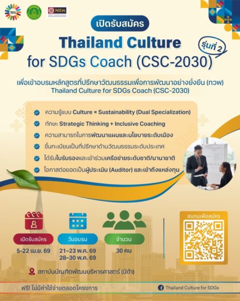กรมส่งเสริมวัฒนธรรม กระทรวงวัฒนธรรม เดินหน้าขับเคลื่อนการพัฒนาเมืองไทยสู่ความยั่งยืน ผ่านการเปิดรับสมัครผู้เข้าร่วมหลักสูตร Thailand Culture for SDGs Coach (CSC-2030) รุ่นที่ 2 ซึ่งเป็นส่วนหนึ่งของการพัฒนากลไก “ที่ปรึกษาวัฒนธรรม” ระดับประเทศ เพื่อสนับสนุนการพัฒนาเมืองด้วยมิติวัฒนธรรมอย่างเป็นระบบ โดยโครงการมุ่งเน้นการเชื่อมโยง “ทุนทางวัฒนธรรม” เข้ากับการพัฒนาเศรษฐกิจ สังคม และคุณภาพชีวิตของคนในพื้นที่ พร้อมยกระดับศักยภาพบุคลากรให้สามารถทำหน้าที่เป็นตัวกลางในการเชื่อมโยงนโยบาย แผนงาน และเครือข่ายความร่วมมือ ทั้งในระดับพื้นที่และระดับประเทศ สอดคล้องกับเป้าหมายการพัฒนาที่ยั่งยืน (SDGs) และกรอบแนวคิด Culture 2030 ของ UNESCO