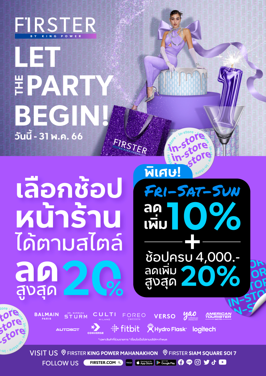 ร่วมปาร์ตี้ช้อปสุดสนุกฉลองเดือนเกิดแบบนอนสต็อปไปกับ FIRSTER BY KING POWER พร้อมสัมผัสกับความคุ้มค่าทุกการช้อป กับแคมเปญ “LET THE PARTY BEGIN ปาร์ตี้สุดมันส์ ช้อปให้ทันดีลแรง!” ได้แล้ว ตั้งแต่วันนี้ – 31 พ.ค. 66 ติดตามรายละเอียดเพิ่มเติมได้ทาง WWW.FIRSTER.COM Facebook : FIRSTER OFFICIAL, Instagram @FIRSTER.OFFICIAL