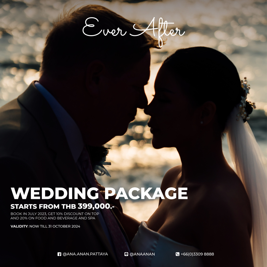 อาณา อานันท์ รีสอร์ท แอนด์ วิลล่า พัทยาขอเสนอโปรโมชั่น Wedding Package สุดพิเศษสำหรับคู่รักที่มีแผนจะแต่งงานภายในเดือนตุลาคม 2567 นี้ ราคาเริ่มต้นเพียง 399,000.- รวมพิธีสงฆ์ พิธีหมั้นและพิธีรดน้ำสำหรับแขก 100 ท่านและรวมงานเลี้ยงฉลองพร้อมอาหารเย็นสำหรับแขก 200ท่าน หากท่านจองและชำระมัดจำภายในเดือนกรกฎาคมนี้ ท่านจะได้รับส่วนลดเพิ่ม 10% นอกจากนี้ ท่านยังจะได้รับส่วนลด 20% สำหรับค่าอาหารและเครื่องดื่ม และ ส่วนลด 20% สำหรับเมนูนวดสปาที่สปาธยาน