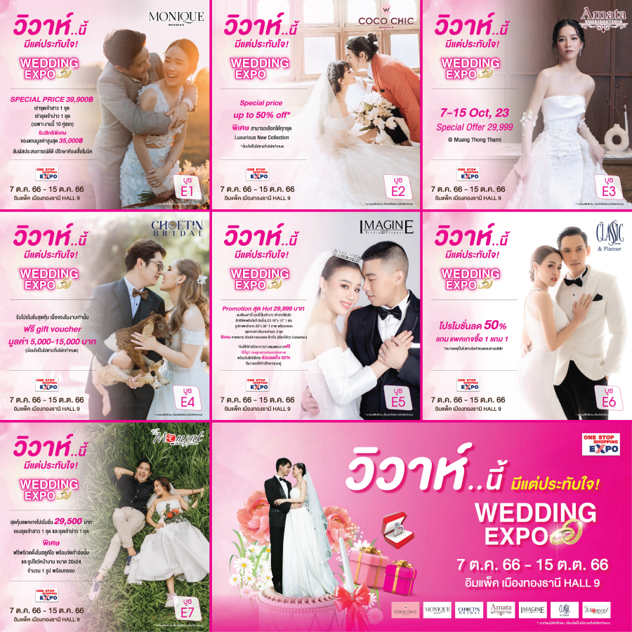 3. งาน Wedding Expo วิวาห์ นี้มีแต่ประทับใจ รวบรวมผู้ให้บริการมืออาชีพ, ถ่ายภาพพรีเวดดิ้ง, กองทัพชุดวิวาห์ บ่าว-สาว มาให้เลือกชมพร้อมแพ็คเกจแต่งงานลดสูงสุด 50% สำหรับทุกคู่รัก จาก 7 สตูดิโอชั้นนำ อาทิ โมนิค สตูดิโอ, โคโค ชิค สตูดิโอ, อมตะ สตูดิโอ, เฌอติน ไบดอล, เดอะโมเม้น สตูดิโอ, อิมเมจิ้นสตูดิโอ และ คลาสสิค สตูดิโอ มาไว้รวมกันในที่เดียวและ ยังเรียกได้ว่าเป็น One Stop Service งานเดียวที่มาครบทุกฟังก์ชั่นการจัดงานแต่งงาน
