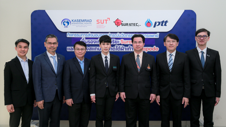 โดยงานวิจัยดังกล่าว ได้รับความร่วมมือซึ่งกันและกันระหว่างบริษัท สุรเทค จำกัด มหาวิทยาลัยเทคโนโลยีสุรนารี(มทส.)และบริษัท ปตท.จำกัด (มหาชน)ในการร่วมกันพัฒนา จนสำเร็จเป็นชุดอุปกรณ์นวัตกรรมทางการแพทย์ “ชุดวิเคราะห์แรงกดใต้ฝ่าเท้าและวิเคราะห์การเคลื่อนไหว” (Suratec Foot Health Analytics Station) ในการรับมอบชุดอุปกรณ์ในวันนี้ได้รับเกียรติจากคุณกันตพร หาญพานิชย์ ประธานเจ้าหน้าที่บริหารฝ่ายการตลาดบริษัท บางกอก เชน ฮอสปิทอล จำกัด (มหาชน)และนายแพทย์ สุรพันธ์ ทวีวิกยการ ผู้อำนวยการโรงพยาบาลเกษมราษฎร์ อินเตอร์เนชั่นแนล รัตนาธิเบศร์เป็นตัวแทนผู้รับมอบ พร้อมด้วยนายกล้า จิระสานต์ ประธานเจ้าหน้าที่บริหารบริษัท สุรเทค จำกัด รศ.ดร.อนันต์ ทองระอา อธิการบดีมหาวิทยาลัยเทคโนโลยีสุรนารี รศ.ดร.สุดเขตต์ พจน์ประไพ อาจารย์ประจำสาขาวิชาวิศวกรรมเซรามิก สำนักวิชาวิศวกรรมศาสตร์ มหาวิทยาลัยเทคโนโลยีสุรนารี และนายสรไนย เลิศอักษร ผู้ช่วยกรรมการผู้จัดการใหญ่แยกก๊าซธรรมชาติ บริษัท ปตท. จำกัด (มหาชน) เข้าร่วมส่งมอบ