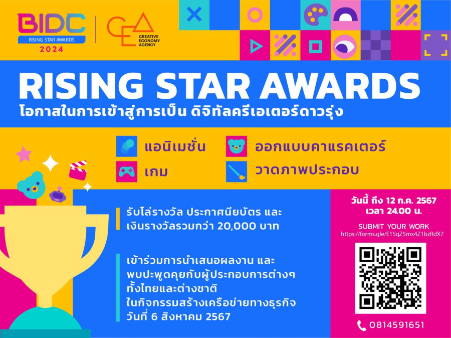 นายกฤษณ์ ณ ลำเลียง ผู้แทนภาคอุตสาหกรรมและนายกสมาคมผู้ประกอบการแอนิเมชั่นและคอมพิวเตอร์กราฟิกส์ไทย (แทกก้า) กล่าวว่า ในปีนี้ จะมีการประกาศรางวัล Rising Star Award สำหรับนักนิสิต นักศึกษา หรือ ผู้ประกอบอาชีพอิสระ ที่มีอายุ 18 – 35 ปี ที่ร่วมส่งผลงาน 4 สาขา ด้านแอนิเมชัน ออกแบบคาแรคเตอร์ เกม และวาดภาพประกอบ เข้าประกวดชิงโล่รางวัล พร้อมเงินรางวัล ประกาศนียบัตร รวมถึงจะได้รับโอกาสนำเสนอผลงานแก่ผู้ประกอบการชาวไทยและต่างชาติ และได้ร่วมพูดคุยกับผู้ประกอบการต่าง ๆ ในกิจกรรมสร้างเครือข่ายทางธุรกิจในโครงการ Bangkok International Digital Content Festival 2024 (BIDC 2024) รวมถึงการประกาศรางวัล Global Achievement Award โดยมอบให้ผู้ประกอบการที่สร้างชื่อเสียงในระดับโลกให้แก่อุตสาหกรรมดิจิตอลคอนเทนต์ ในสาขา เกม แอนิเมชัน และ วิชวลเอฟเฟกต์