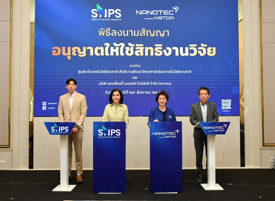 บริษัท สเปเชี่ยลตี้ เนเชอรัล โปรดักส์ จำกัด (มหาชน) หรือ SNPS ร่วมกับ ศูนย์นาโนเทคโนโลยีแห่งชาติ (นาโนเทค) สำนักงานพัฒนาวิทยาศาสตร์และเทคโนโลยีแห่งชาติ (สวทช.) ลงนามความร่วมมือด้านการวิจัยและพัฒนา B GOLD สารสกัดกระชายดำบริสุทธิ์ เป็นสารออกฤทธิ์สีเหลืองทอง ซึ่งถือเป็นนวัตกรรมที่ได้รับการจดสิทธิบัตร อีกทั้งยังผ่านการทดสอบทางคลินิกทำให้มีประสิทธิภาพในการต้านอนุมูลอิสระ ช่วยชะลอวัย ป้องกันเซลล์ผิวจากความเสียหาย 35.3-56.9% ปกป้องการทำลาย DNA อันเป็นสาเหตุนำมาสู่อนุมูลอิสระ ซึ่งทำให้เกิดความชราได้ 44.6% และช่วยลดเลือนริ้วรอยหมองคล้ำ รวมถึงกระตุ้นการสร้างคอลลาเจน 48-50% โดยมี รศ.ดร.พรรณวิภา กฤษฎาพงษ์ ประธานกรรมการบริหาร และดร.กฤษฎา กิตติโกวิทธนา ประธานเจ้าหน้าที่ฝ่ายวิจัยและพัฒนา พร้อมด้วย
